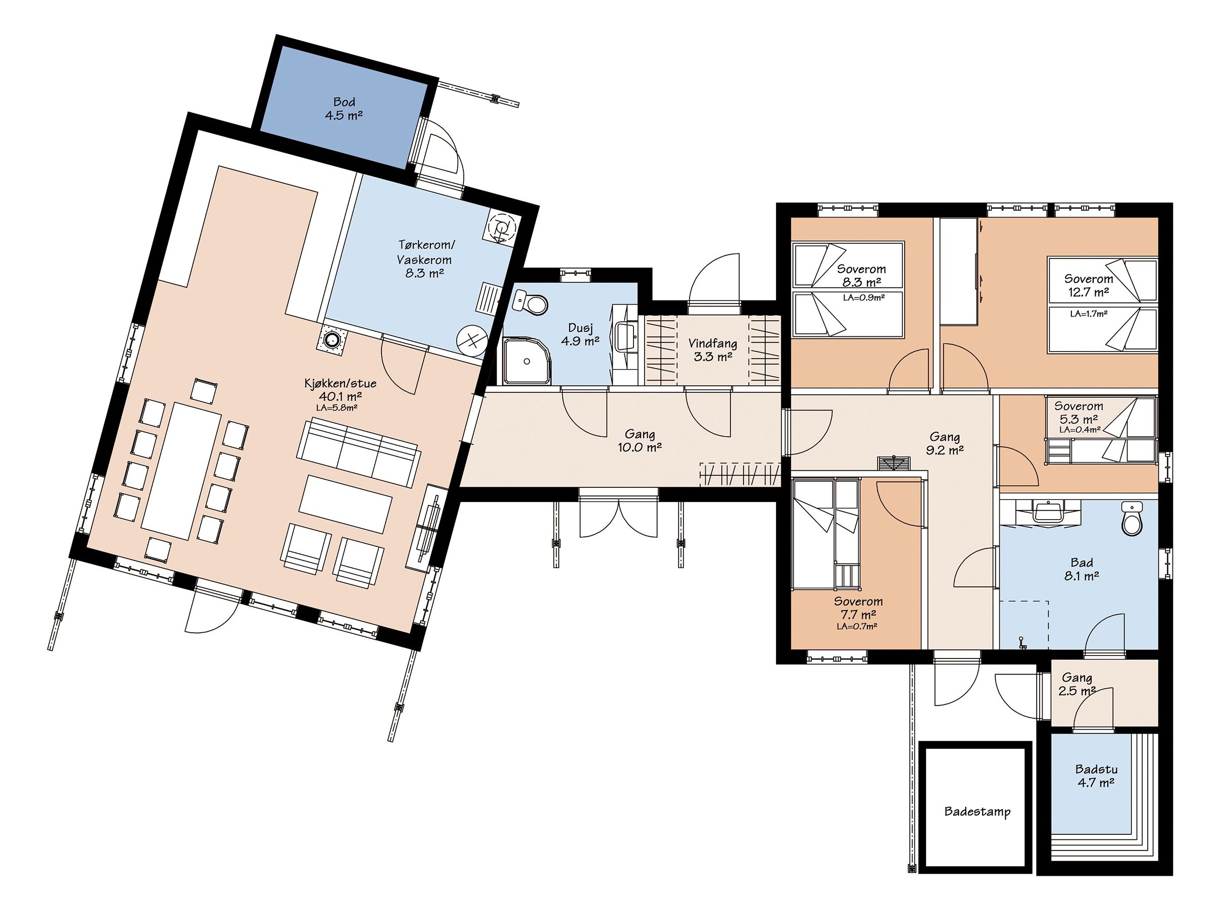 Dette er hytten for deg som er ute etter det lille ekstra. Her kan du finne alt av komfort som du skulle ha behov for på hytten. Den utvendige overbygde badestampen gjør at det er mulig å tilbringe mange sene kvelder ute hele året. Hytten er også tegnet slik at man får en stor skjermet uteplass.